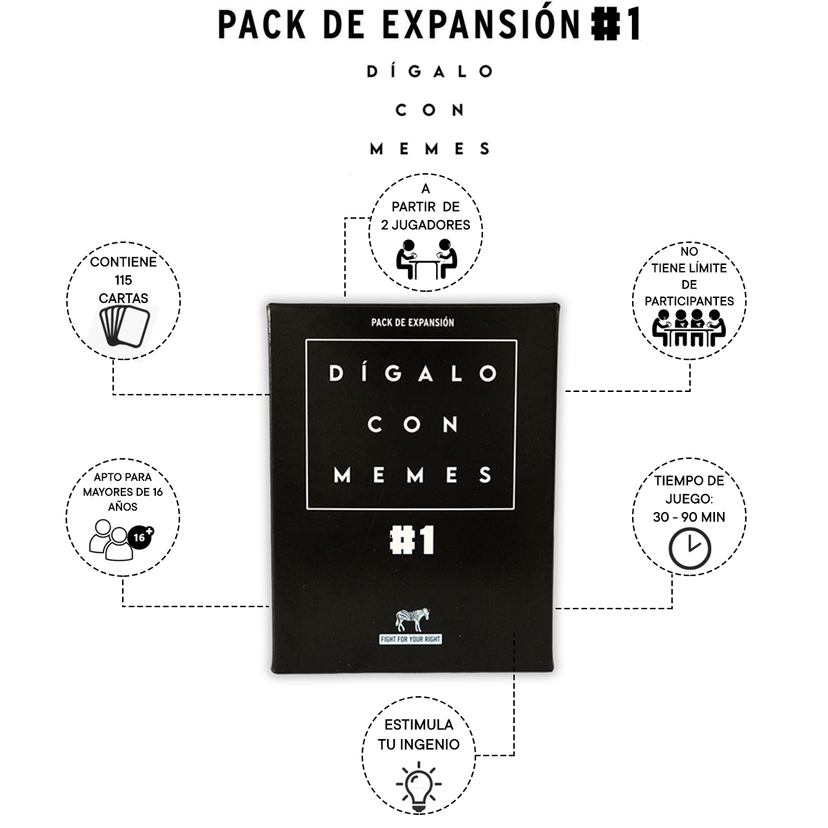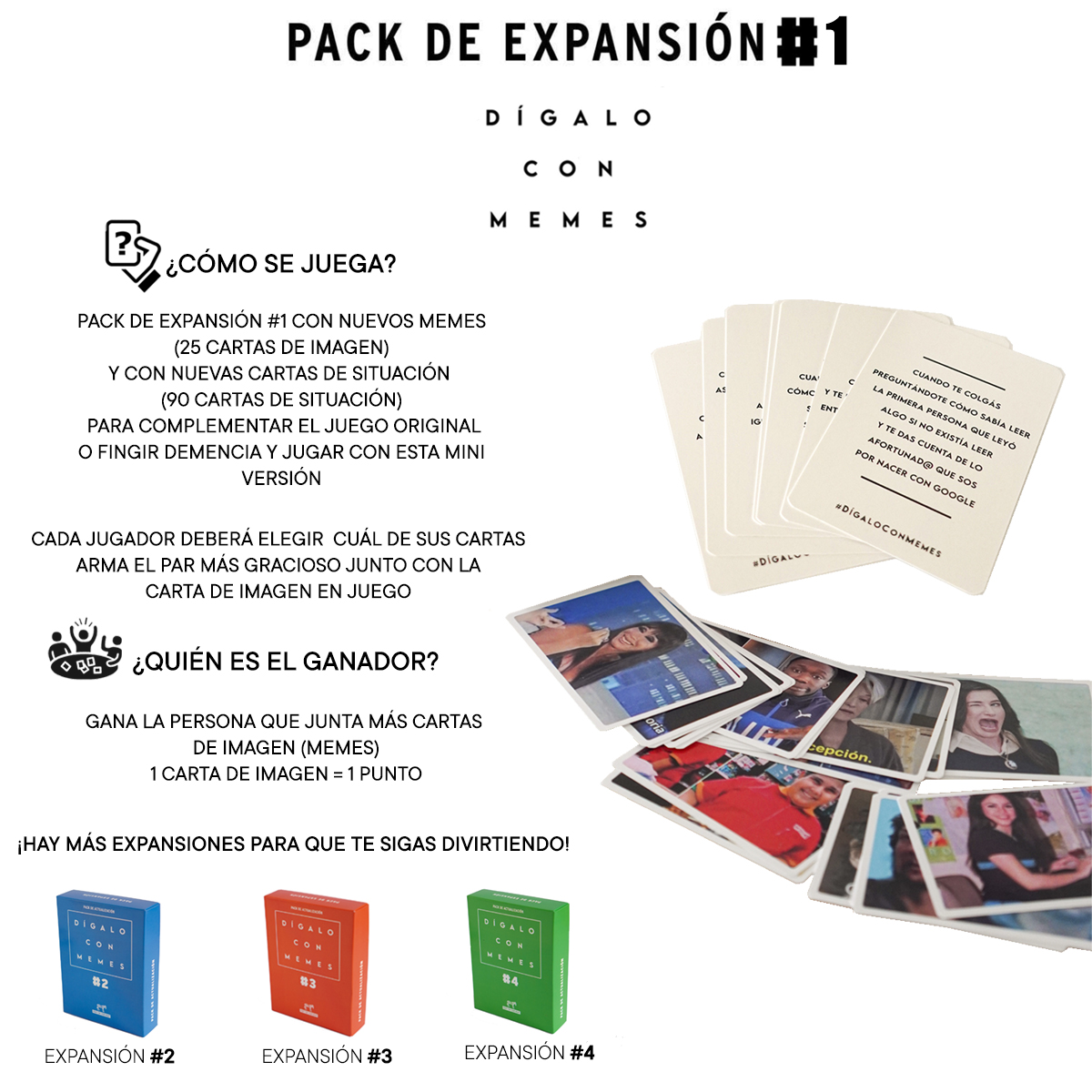El pack de expansión #1 de Dígalo Con Memes incluye 90 cartas de situación y 25 cartas de imagen.