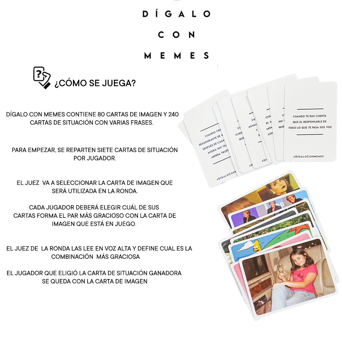 Dígalo con memes incluye 240 cartas de situación y 80 cartas de imagen.